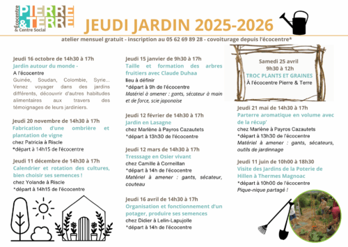 Atelier mensuel convivial et gratuit d’échange de bonnes pratiques au jardin, sous la houlette de Marc, Animateur Nature et Maître Composteur.