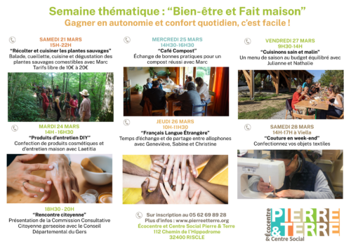 - 9h30-14h – Atelier « Cuisinons sain et malin » : Un menu de saison au budget équilibré avec Julianne et Nathalie